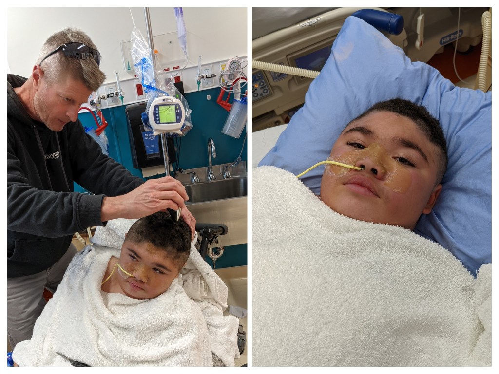 AJ enjoyed viewing pictures and a video of the “baby upstairs”, Hope, sent by momma Brittany. Little Hope and AJ both sport the same BiPAP nose breathing tube. AJ was fascinated to see such a small baby having to be equipped with a similar apparatus as he was. This was an instant connection with such a precious new friend and family in the hospital.