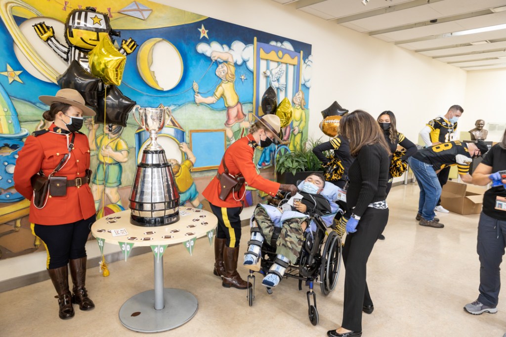 Dec. 9 – Some players from the CFL Tiger Cats & Grey Cup showed up at Mac. AJ got to travel downstairs and meet with them.